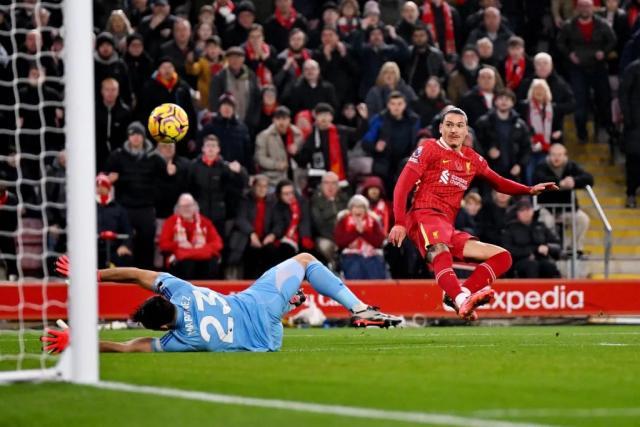 第32分钟,利物浦再次发起反击,努涅斯射门遗憾高出。